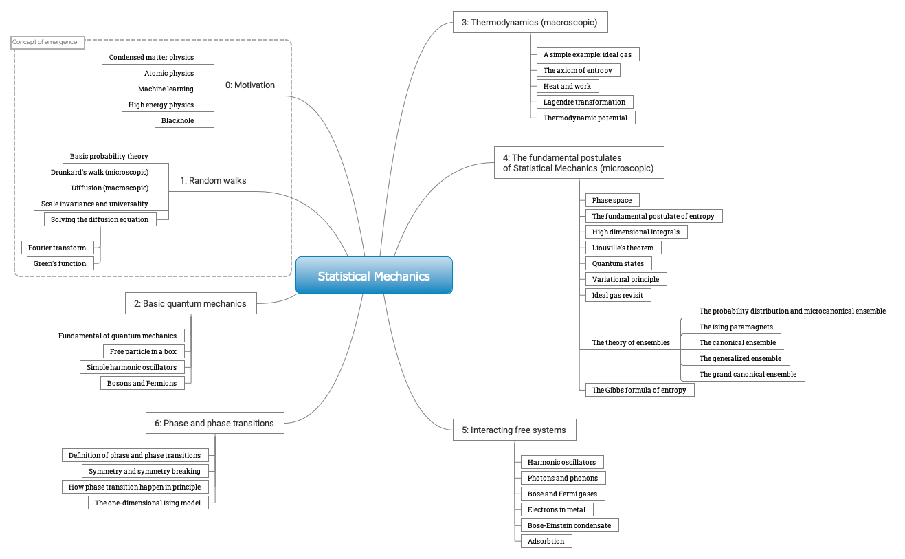 In this course, as many textbooks did, we will start from the idealized limit where the microscopic theory is “simple” in the sense that they do not have interaction. Those models are usually too naive to describe real physical systems. However, the non-interacting limit allows us to go pretty far and make an explicit connection with the macroscopic observables. In that sense, they are very useful for us to formulate abstract ideas in statistical mechanics. We will formally describe the idea of statistical mechanics and use those non-interacting systems to build some intuition about the meaning of the system.