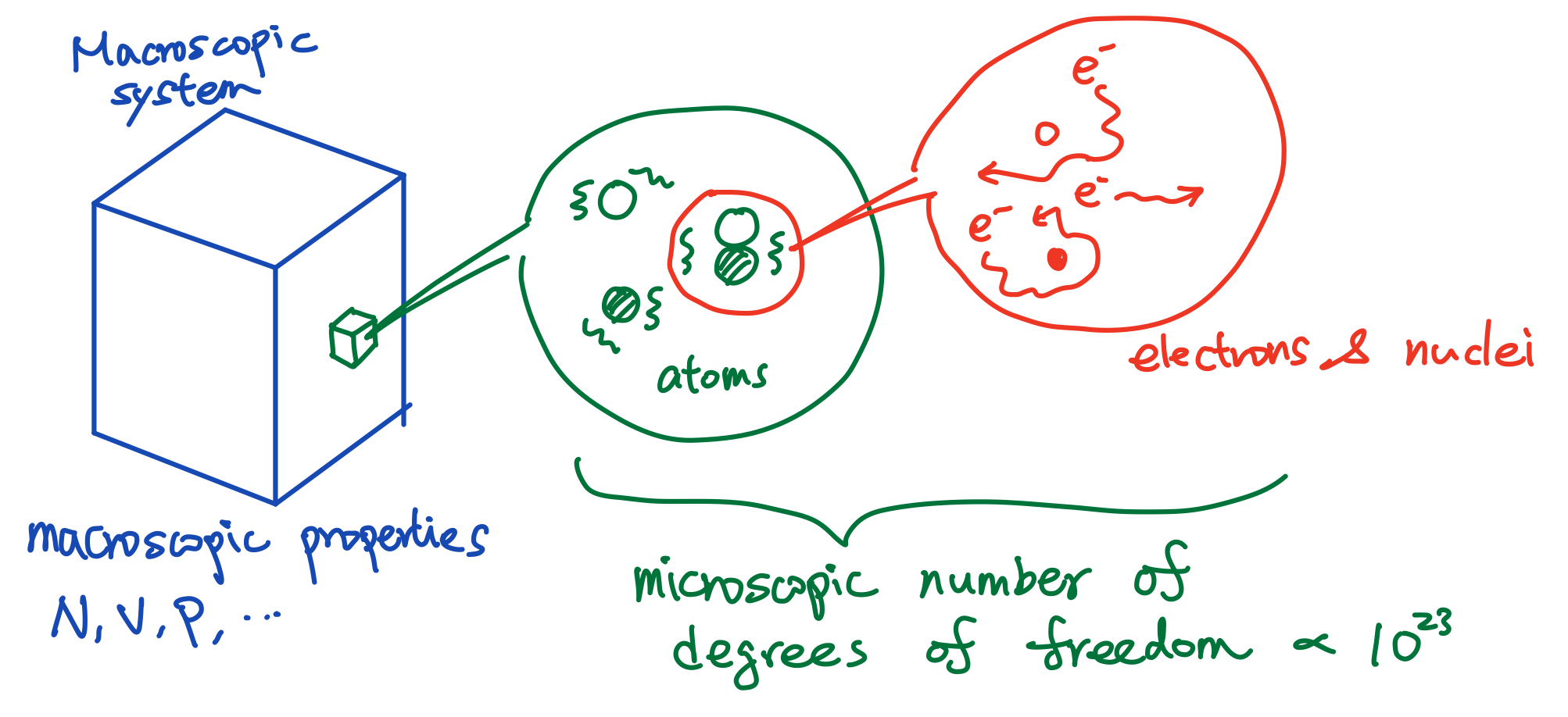 Different systems might have very different microscopic descriptions. Therefore, going from microscopic physics to macroscopic physics also varies. It is usually challenging to derive the macroscopic expressions from microscopic theories. The challenge lies in the microscopic degrees of freedom that interact with each other Fig. 1.